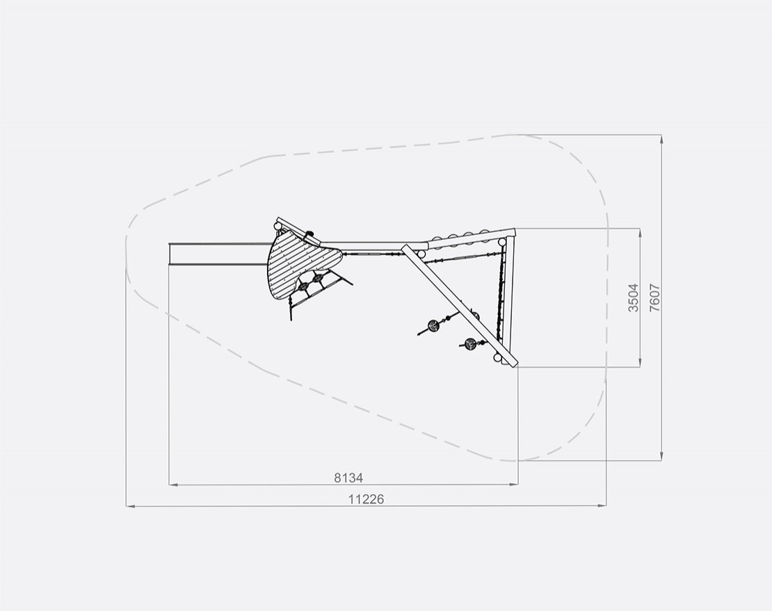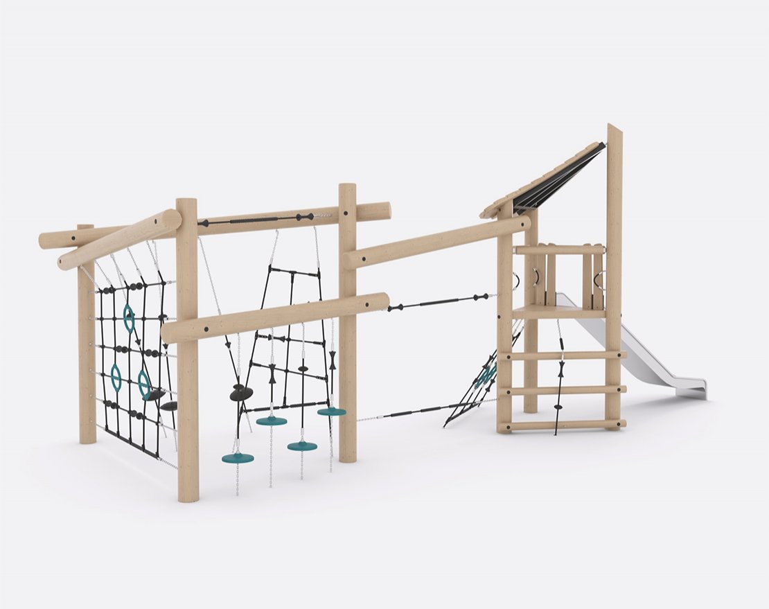 Состоит из опорных стоек, перекладин, канатной сетки и металлической открытой горки с защитными бортиками. Конструкция также оснащена канатными стропами с уступами, по которым можно лазить.