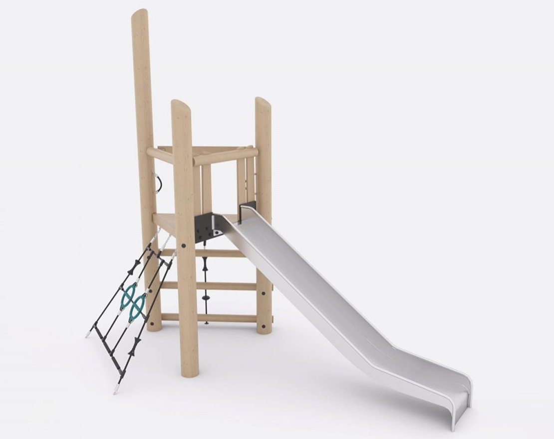 Состоит из опорных стоек, перекладин, канатной сетки и открытой металлической горки с защитными бортиками. Для большего комфорта, канатная сетка оснащена пластиковыми уступами.