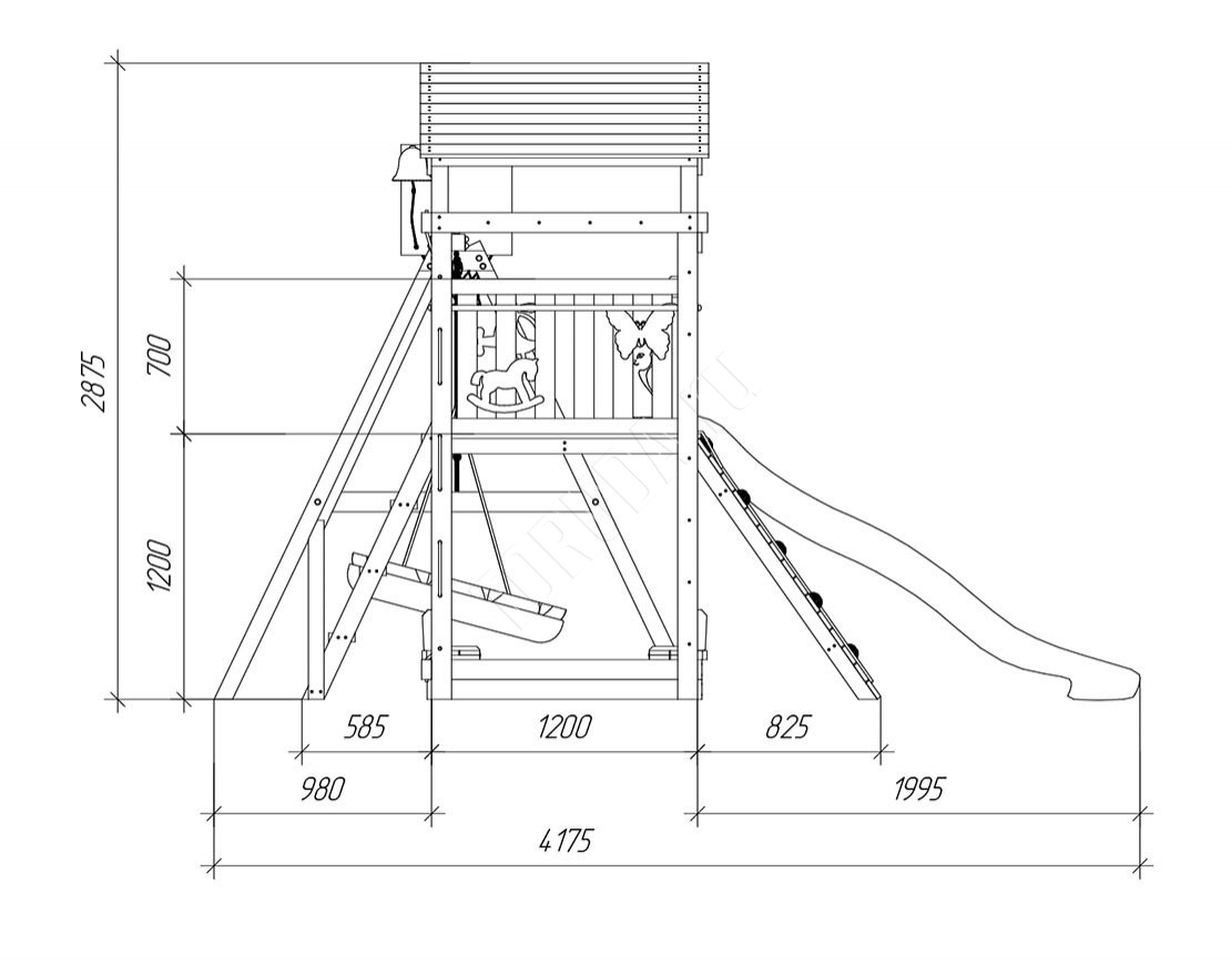 В основе натуральный материал – клееный брус 75х75 мм. Конструкция и элементы качельных подвесов разработаны и произведены согласно ГОСТ.