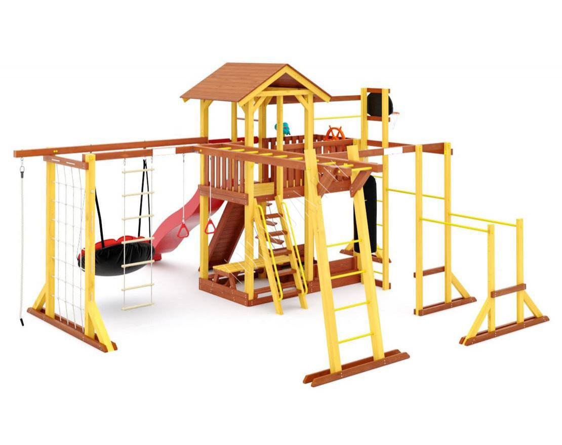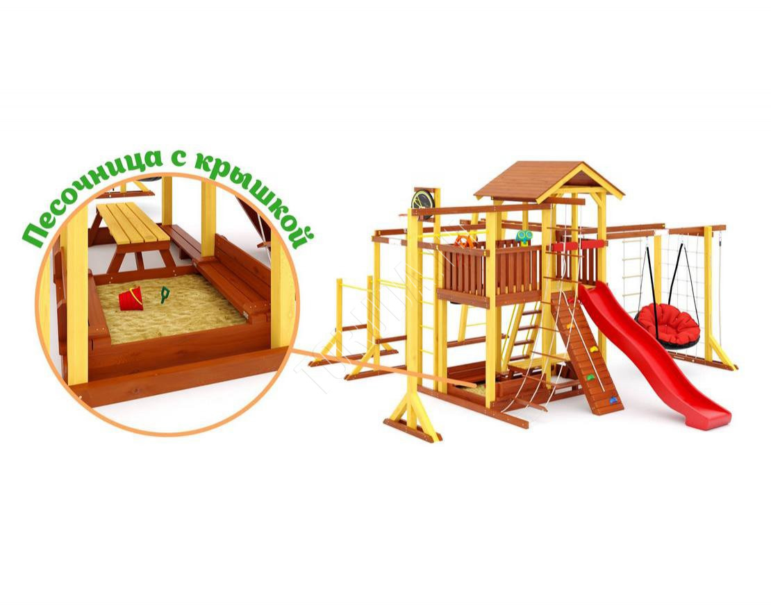 - Многообразие игровых элементов: в комплектацию входят скалодром, сетка-лазалка, турники, гимнастические кольца, песочница с крышкой, которая трансформируется в две лавочки, и многое другое.