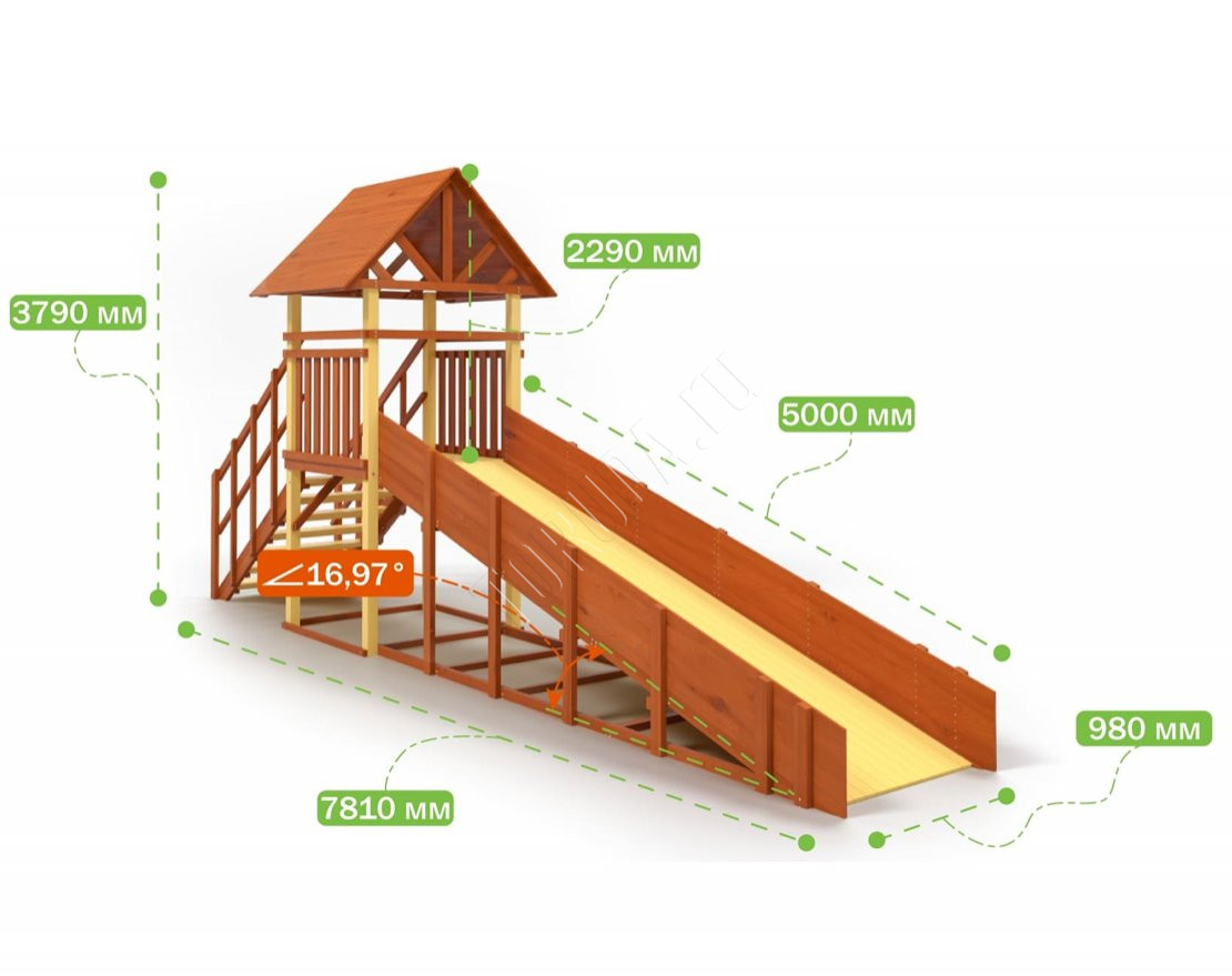 Силовые детали конструкций производены из крепкого клееного бруса с квадратным сечением (сторона 90 мм). Дерево покрыто натуральной краской на водной основе, которая выдерживает перепады температур и при этом абсолютно безопасна для малышей.