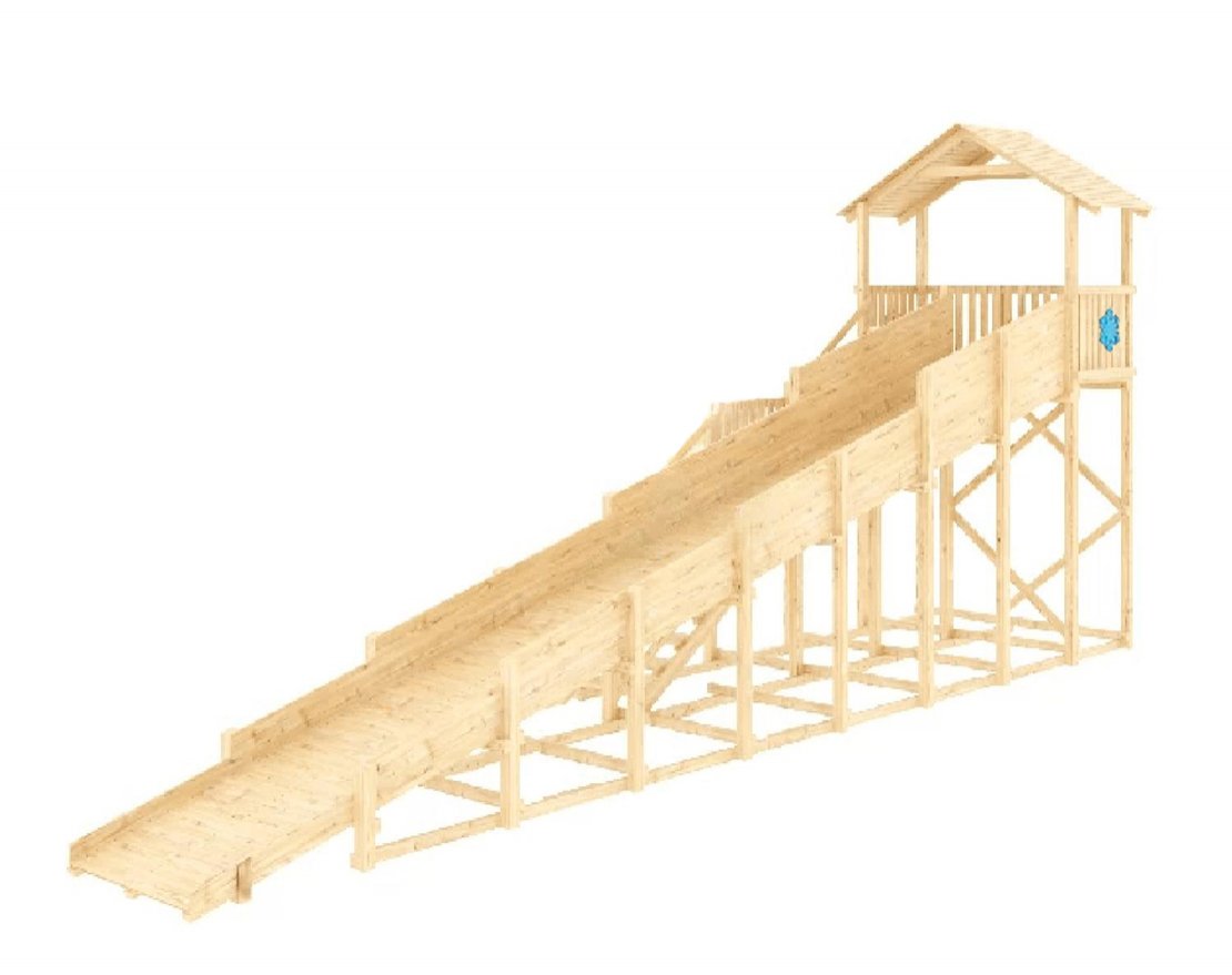 10-ти метровый скат безопасен для катания детей дошкольного возраста, потому что он имеет оптимальную высоту. Дети могут подниматься вверх по удобной лестнице, держась за перила. Площадка в верхней части достаточно просторная и оборудована деревянной крышей. Она позволит ребятам укрыться от обильных осадков, ветра, весело общаясь друг с другом.