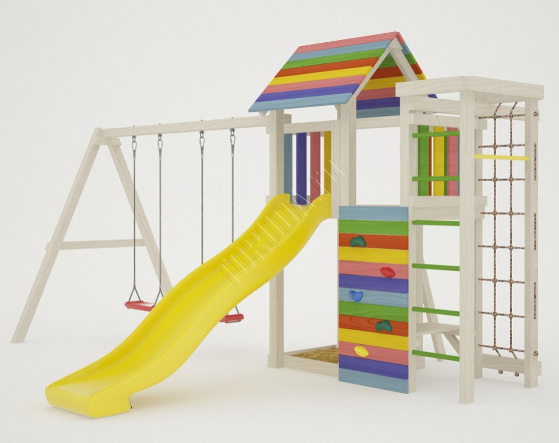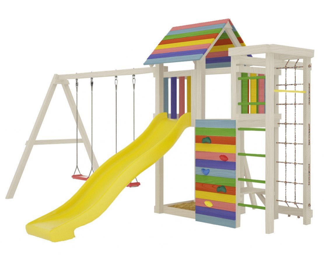 - Это универсальное решение для активного досуга и позитивного настроения непосед с трех лет. Комплекс безопасен – конструкция, качество древесины и подвижных элементов соответствуют ГОСТ. Основным материалом является экологичный клееный брус, балки которого отшлифованы и имеют закругленные края.