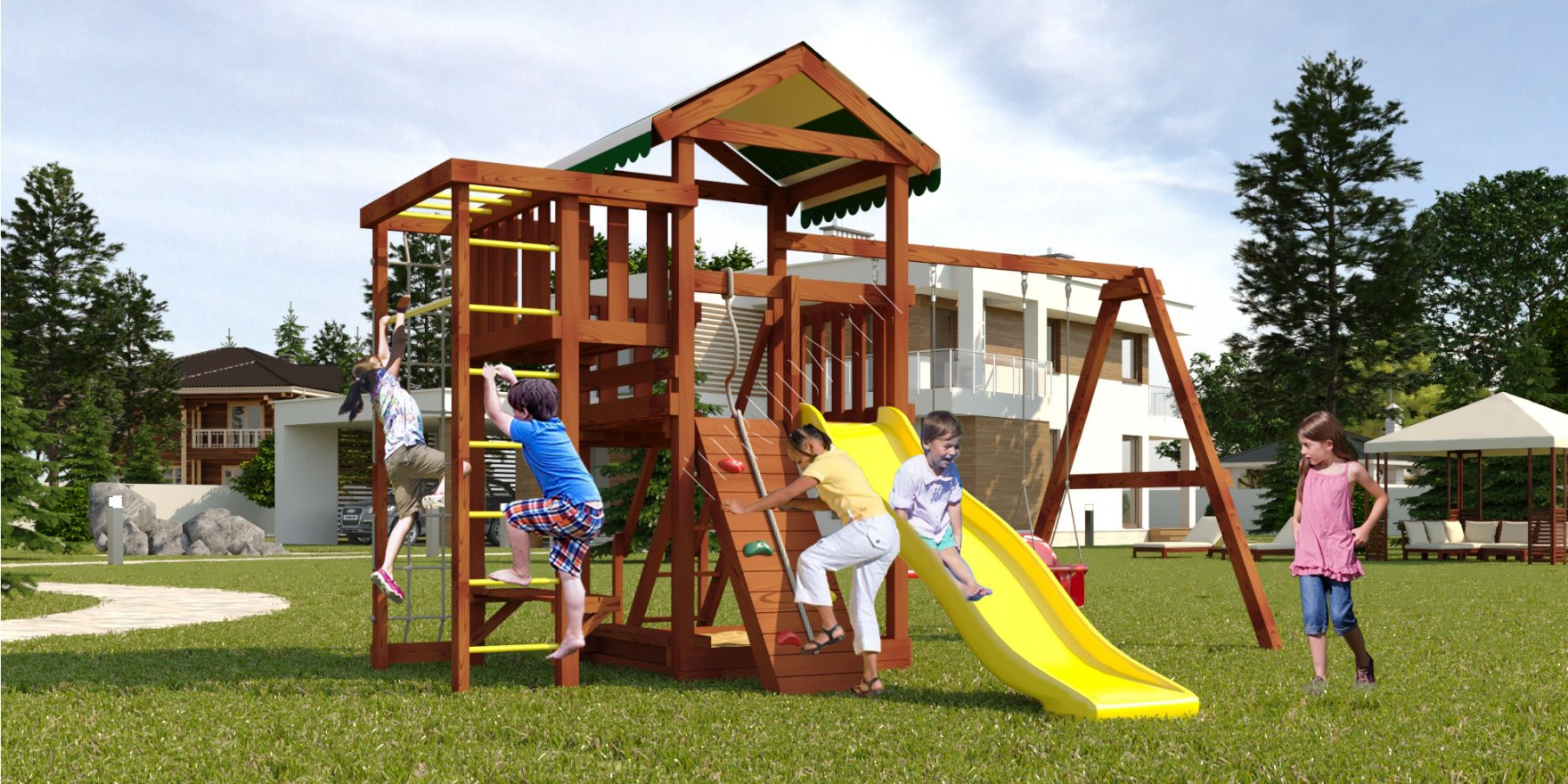Конструкция сертифицирована и безопасна. Крепежи скрыты под хорошо закрепленными заглушками – поэтому даже малыши не поранятся. Каркас состоит из натуральных деталей – клееного бруса квадратного сечения со стороной 75 мм. Во избежание получения заноз и ссадин дерево отшлифовано, а края скруглены.