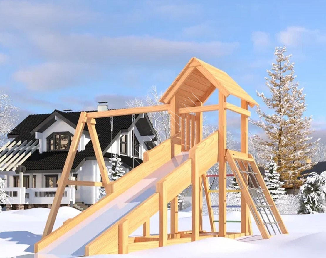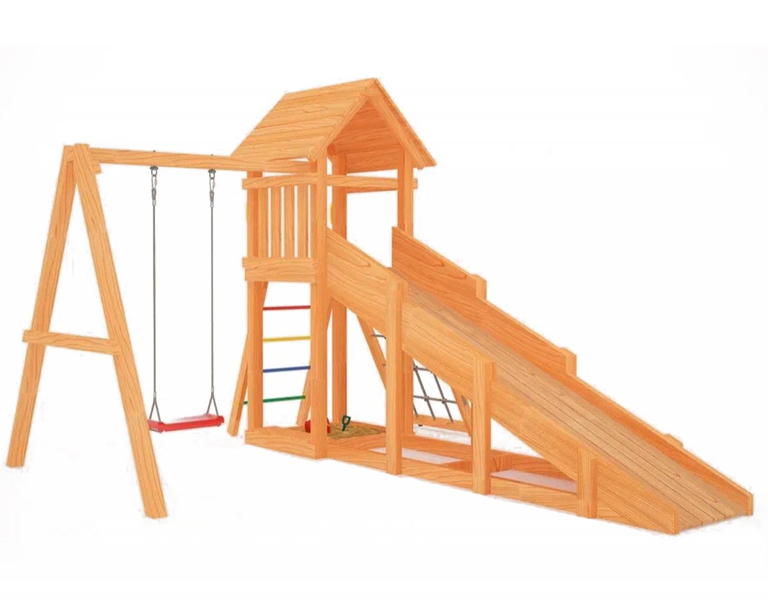 Площадка сохраняет геометрию рамы, содержит натуральные материалы, прошедшие сертификацию. Балки клееного бруса гладкие, острые края скруглены – отсутствие ран и ссадин важнее всего.